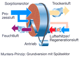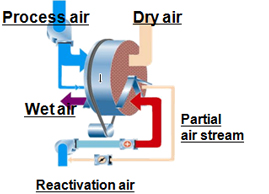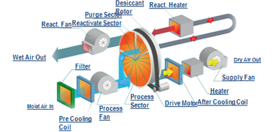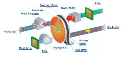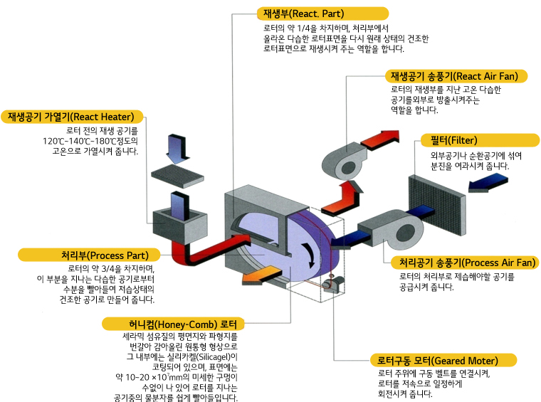 Rotor형 제습 공조기는 공기중의 수분을 회전하는 Rotor의 처리측(Process Air)으로 통과하여 연속적인 저 노점 제습공기를 얻을 수 있는 고 효율적인 회전형 고체 흡착식 제습기 입니다.
