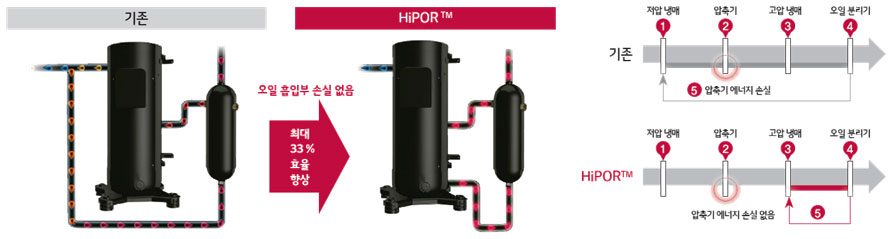 세계 최초 독자적인 압축기 오일 관리 기술인 HiPOR™은 기존의 압축기 입구에서 회수되던 오일을 압축기 내부로 직접 회수하여, 오일로 인한 효율 저하를 근본적으로 차단함으로써 효율과 난방 능력의 극대화.