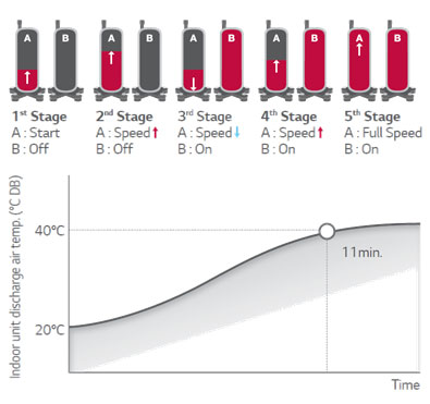 4세대 인버터 압축기 2대를 동시에 초고속 제어함으로써 성능의 손실을 최소화할 뿐만 아니라, 쾌속 냉방효과 실현.