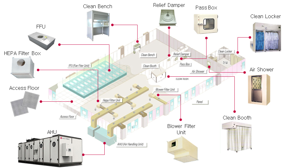 클린룸에 인원 입실 및 물품 반입, 존(ZONE)별 차압 제어, 그리고 기타 부속, 클린룸의 청정도 유지를 위하여 Air Shower, Pass Box, Clean Unit, Relief Damper, Blower Filter Unit등을 설치
