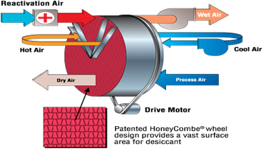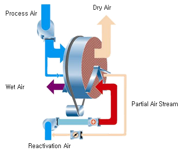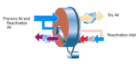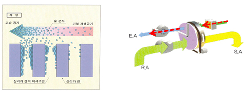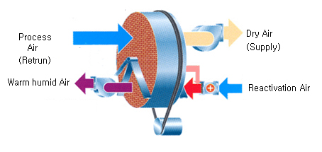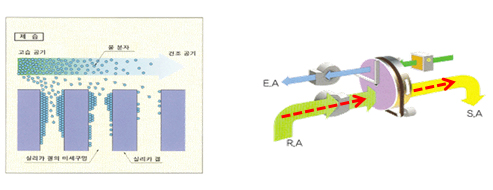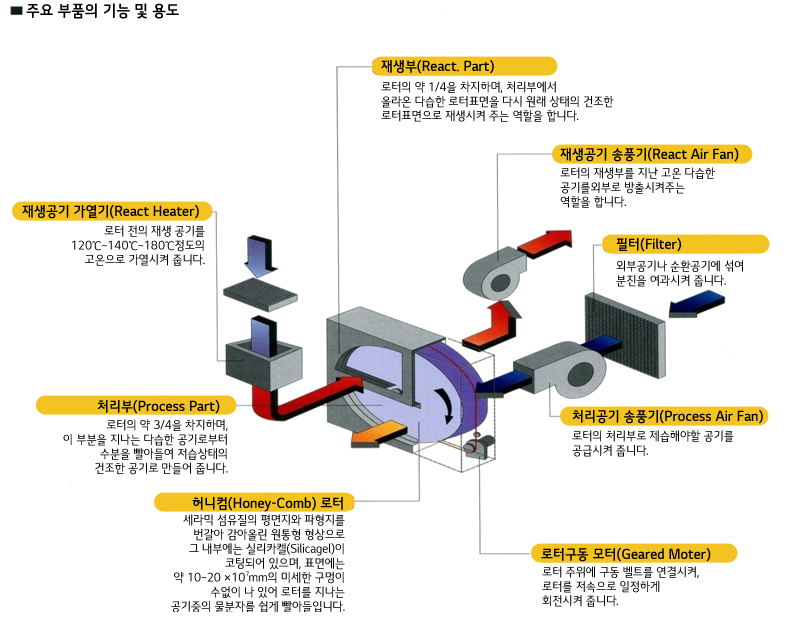 실내에서 Return된 공기 또는 외부에서 유입(Cooling)된 공기는 처리부 (Process Zone)를 통과 하면서 공기중에 함유된 수분이 Honey Comb모양의 벽면 내부에 흡착되고 건조한 공기만 공급한다.